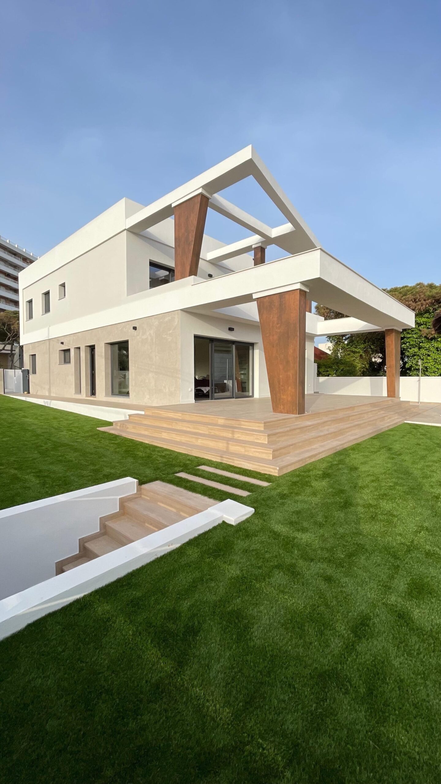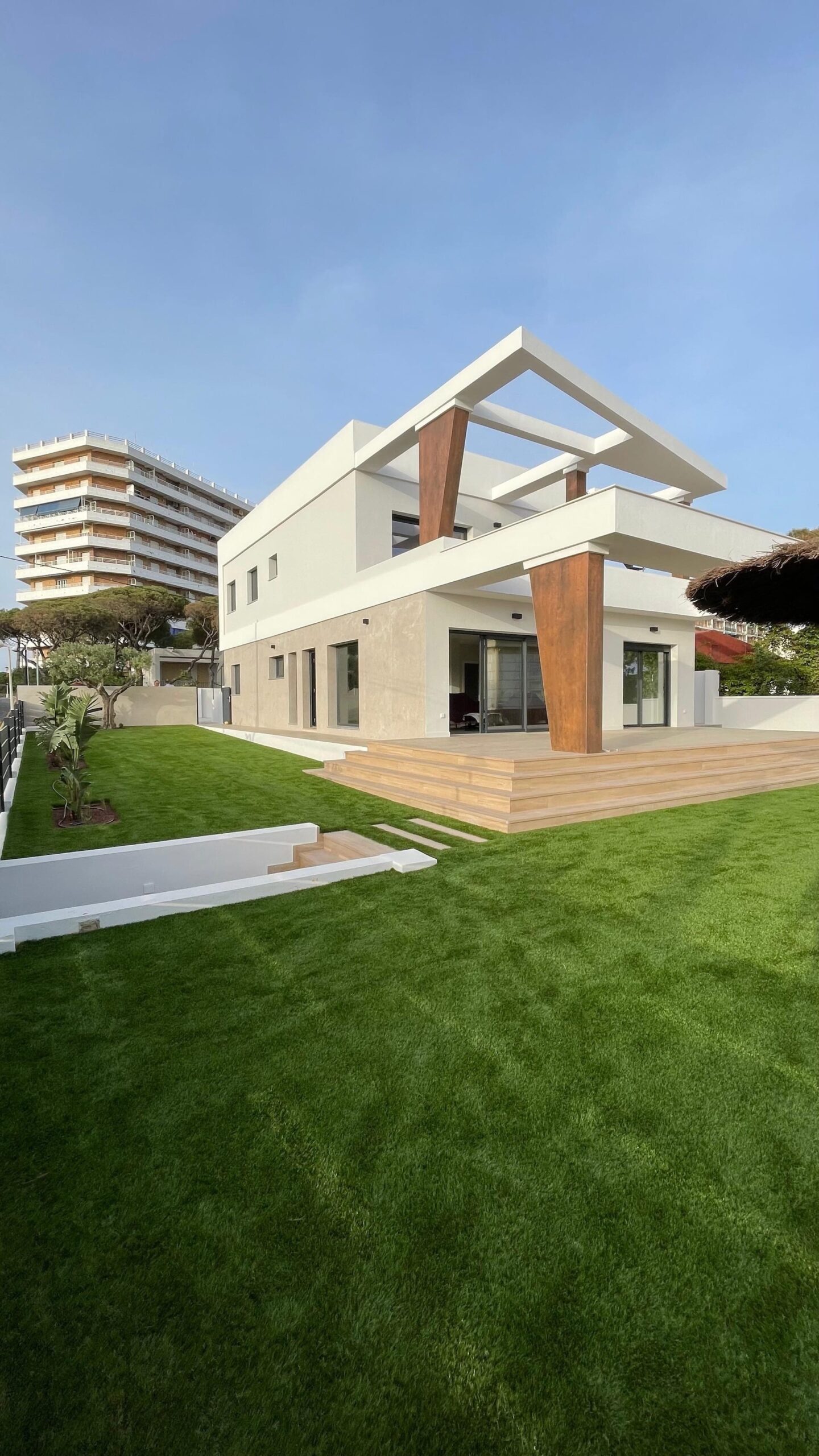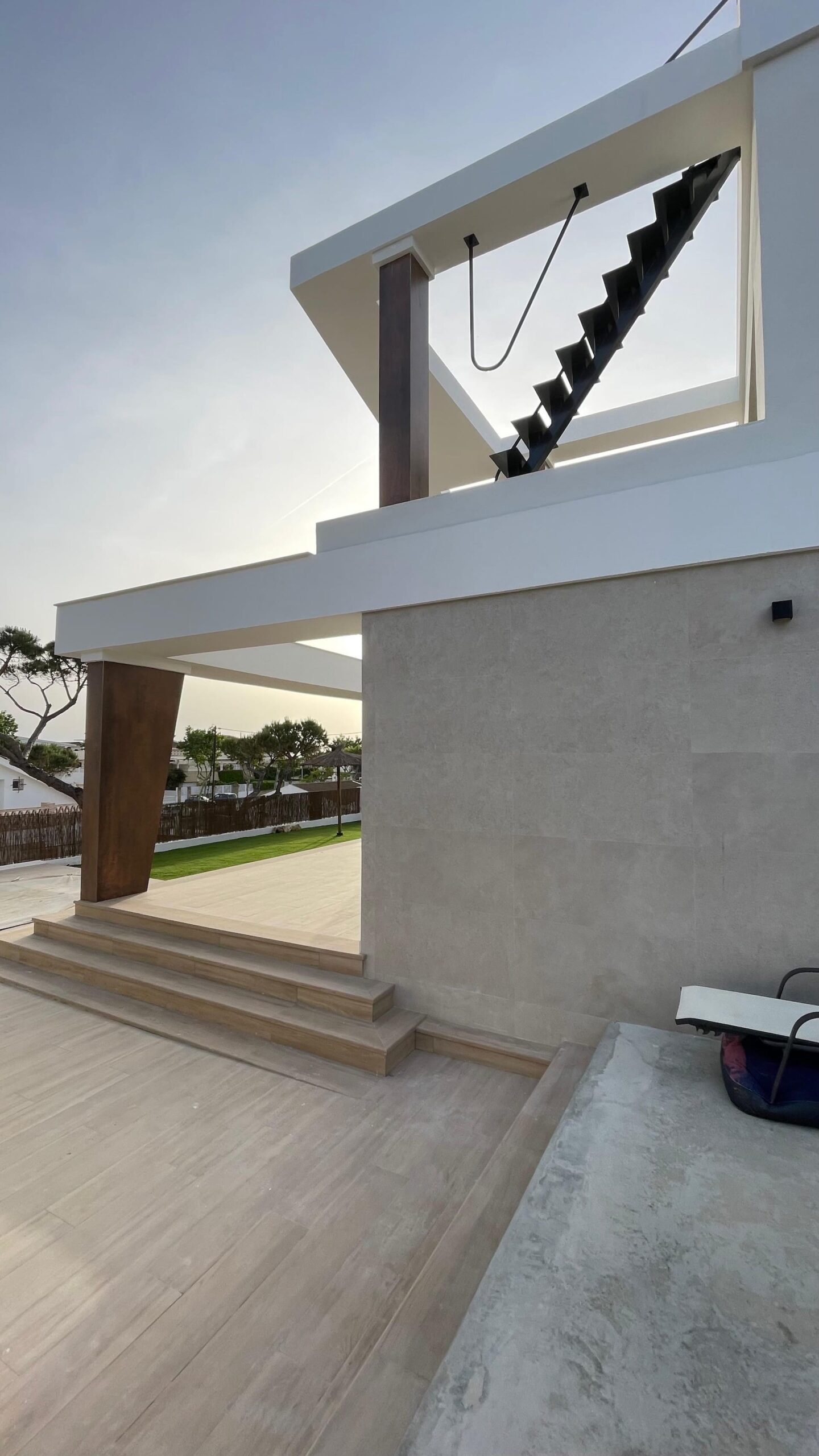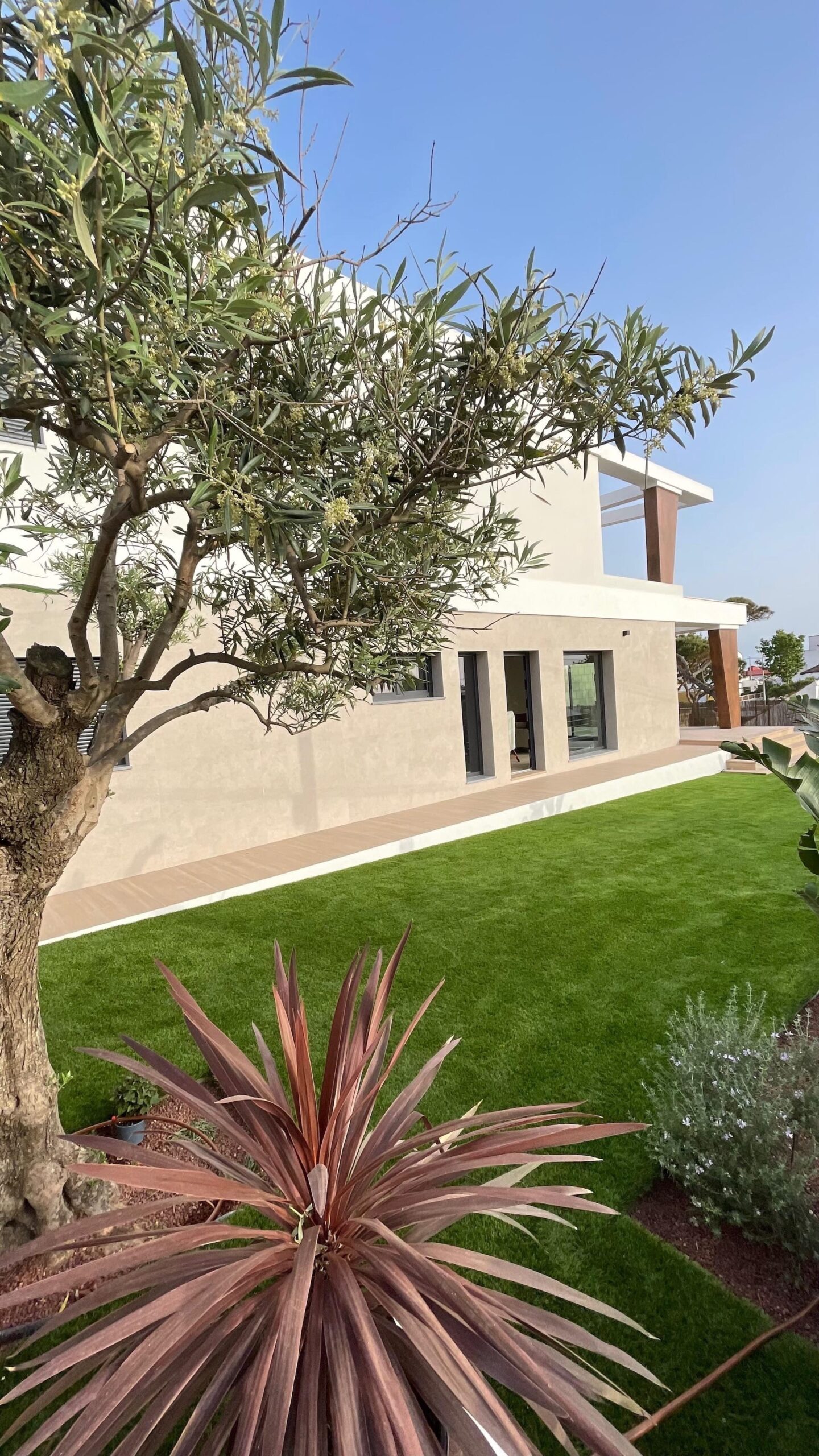 El diseño del espacio exterior se ha planteado de forma coherente con la arquitectura, incorporando zonas ajardinadas, recorridos y áreas de estancia que completan la experiencia de uso de la vivienda, siempre bajo la premisa de aprovechar al máximo las condiciones climáticas y la proximidad al mar.