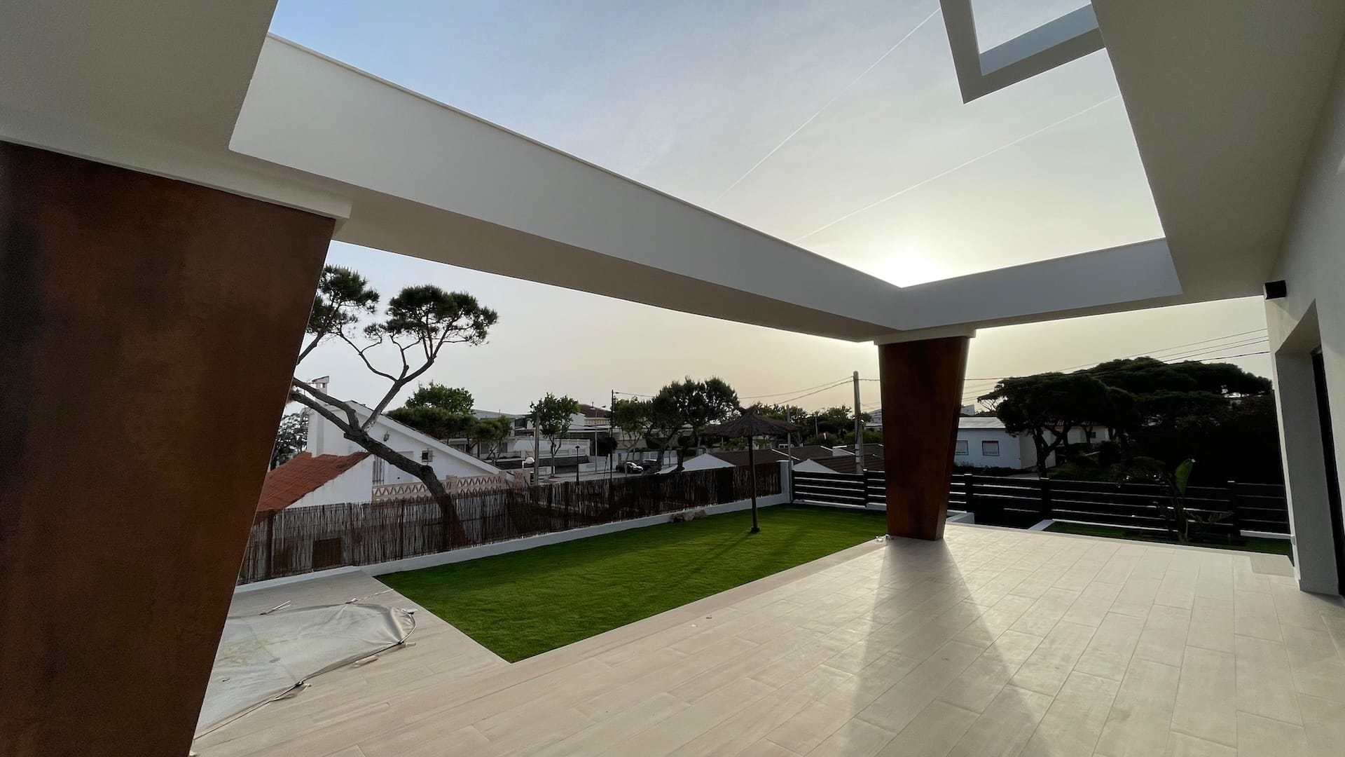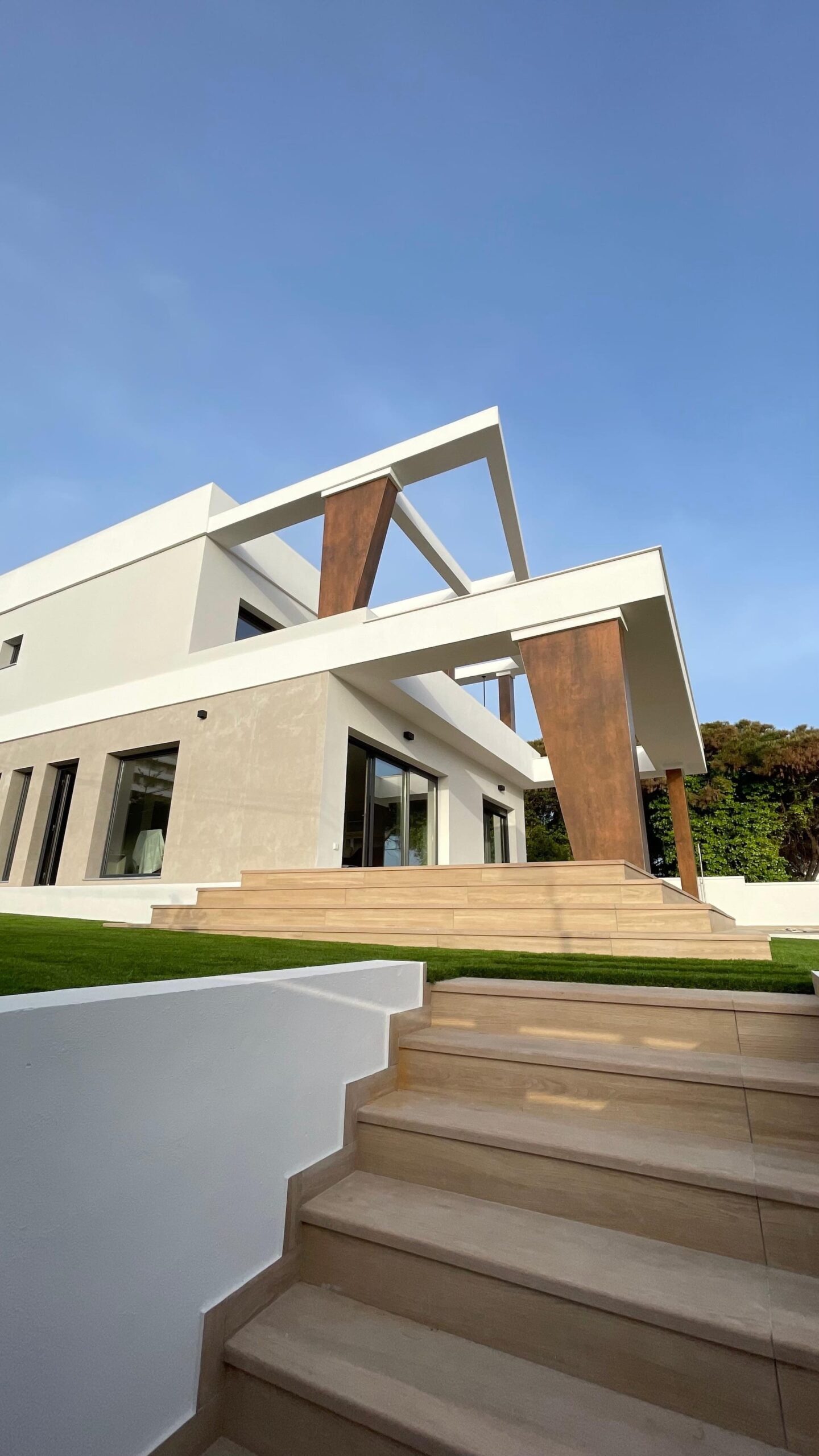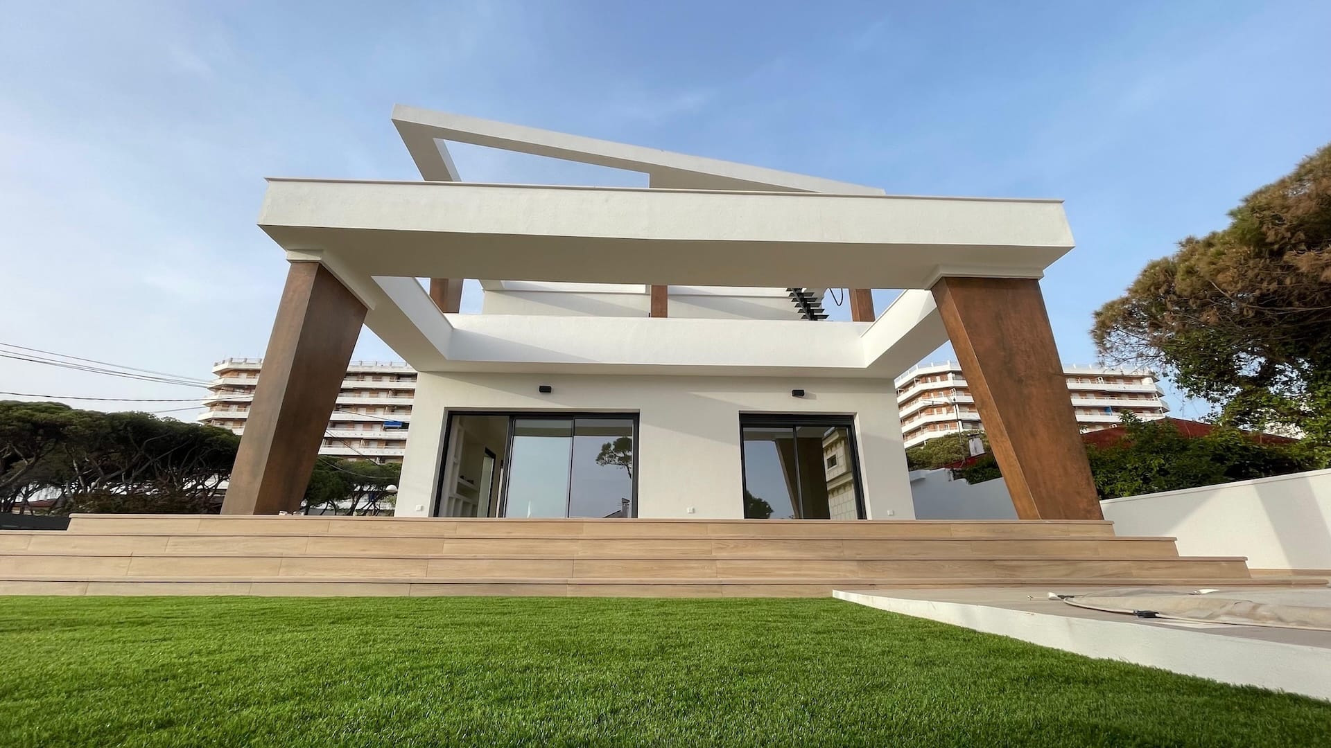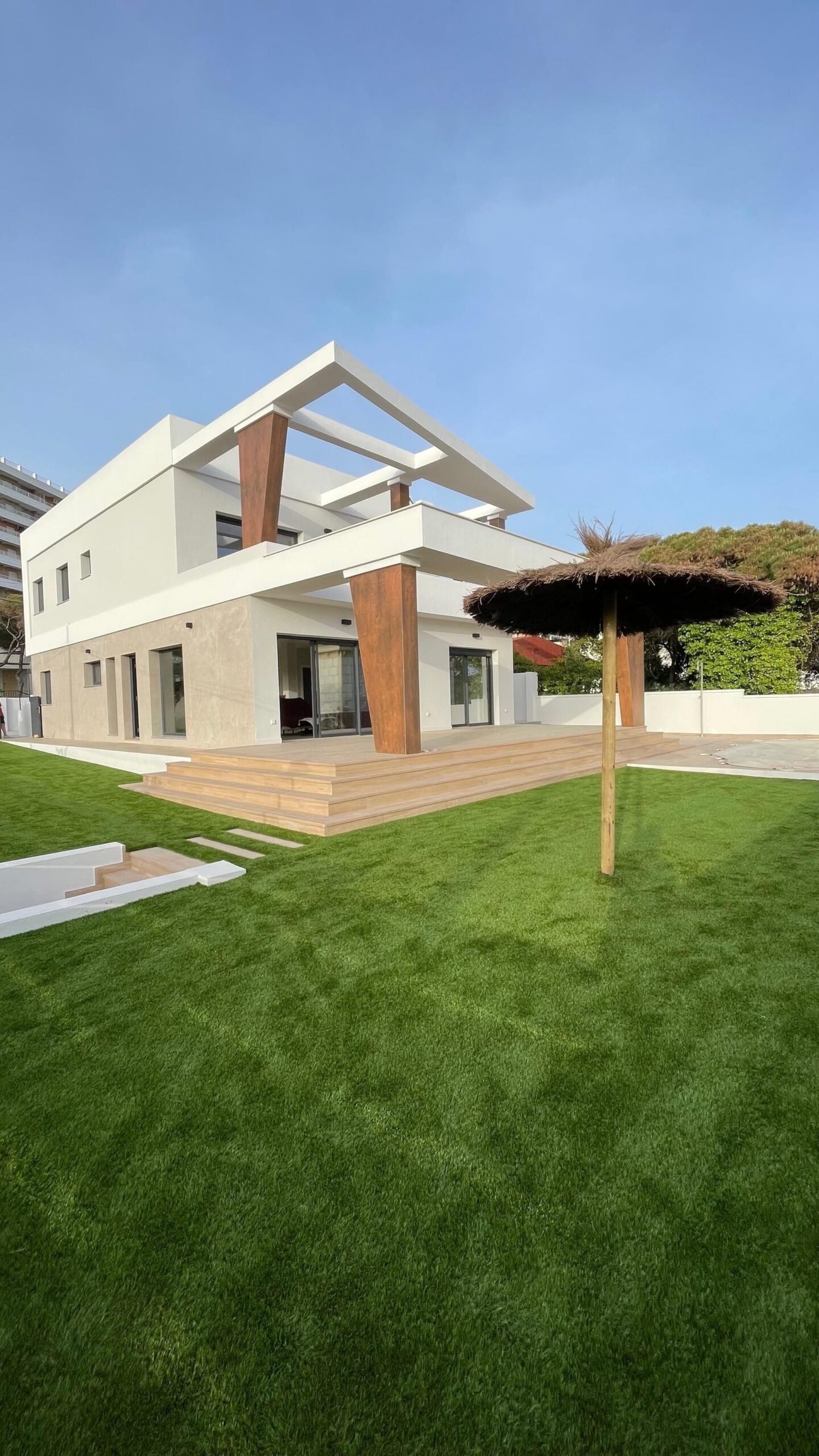 El diseño del espacio exterior se ha planteado de forma coherente con la arquitectura, incorporando zonas ajardinadas, recorridos y áreas de estancia que completan la experiencia de uso de la vivienda, siempre bajo la premisa de aprovechar al máximo las condiciones climáticas y la proximidad al mar.